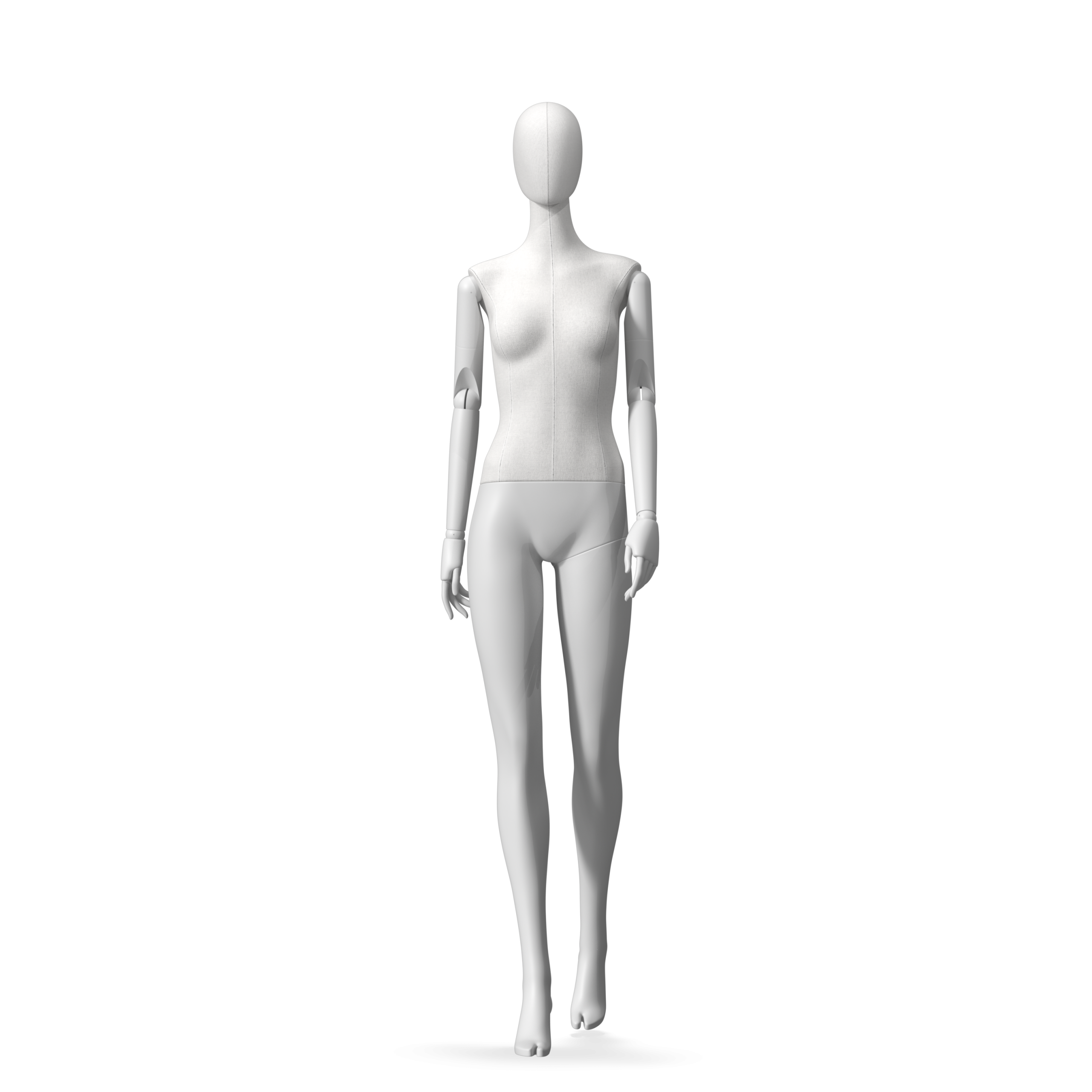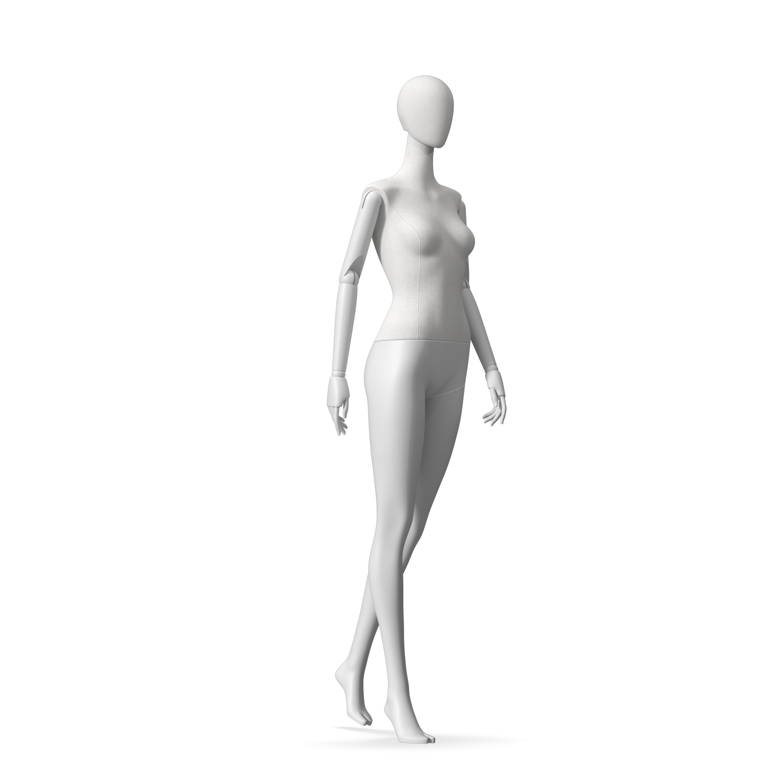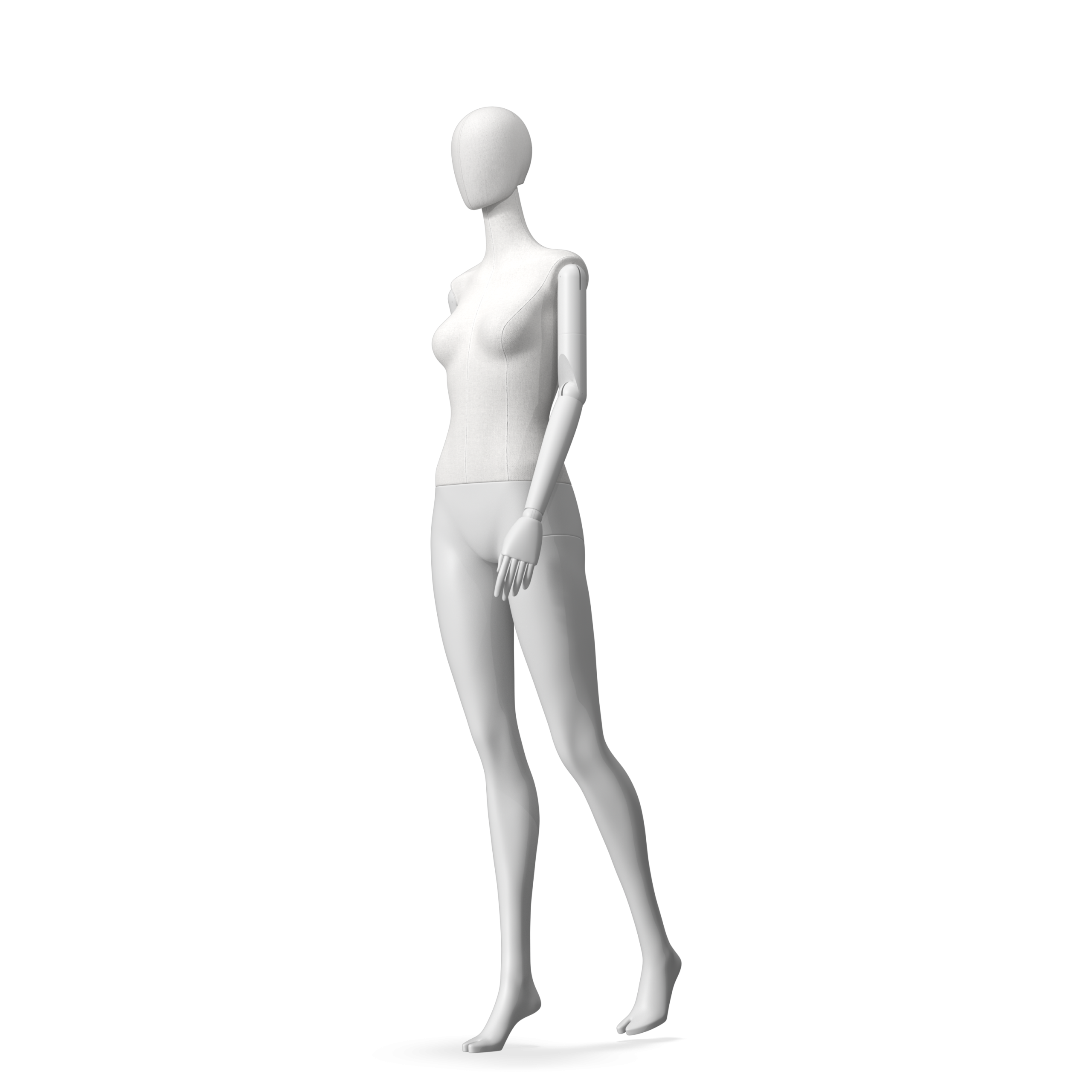 The Female Radiant Fabric is covered with fbr-amjf640 canvas linen look fabric and has C8 white matte, wooden articulated arms. She has a detachable 360˚ Egg Head with a NO-GAP design. Different head options can be ordered seperately. A 42cm Round Glass Base with a Silver Chrome Upright & Calf Pin is included.